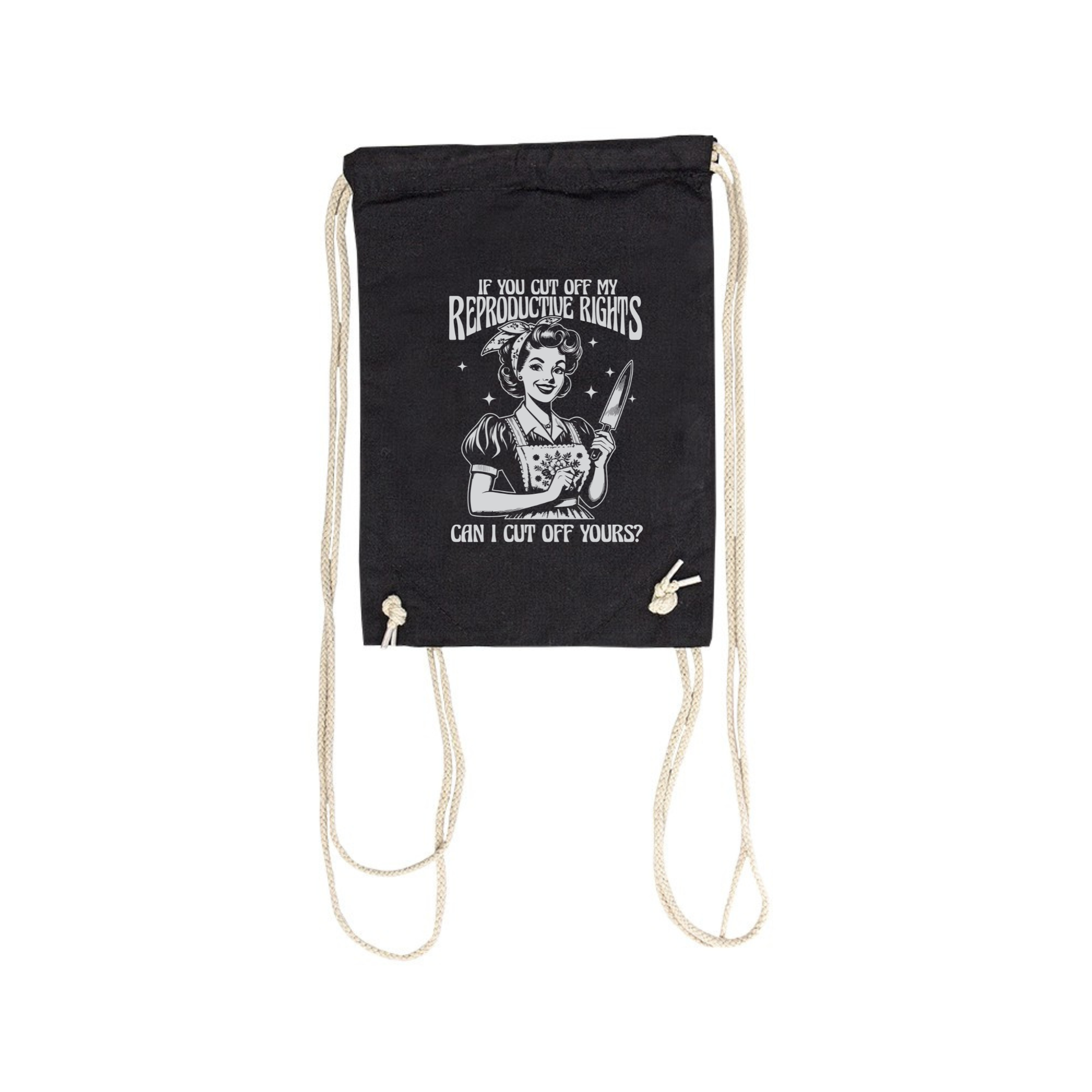 Mit dem provokanten Spruch „If you cut off my reproductive rights, can I cut off yours?“ verbindet dieses Design feministischen Widerstand mit schwarzem Humor – und einem klaren „try me“-Vibe.